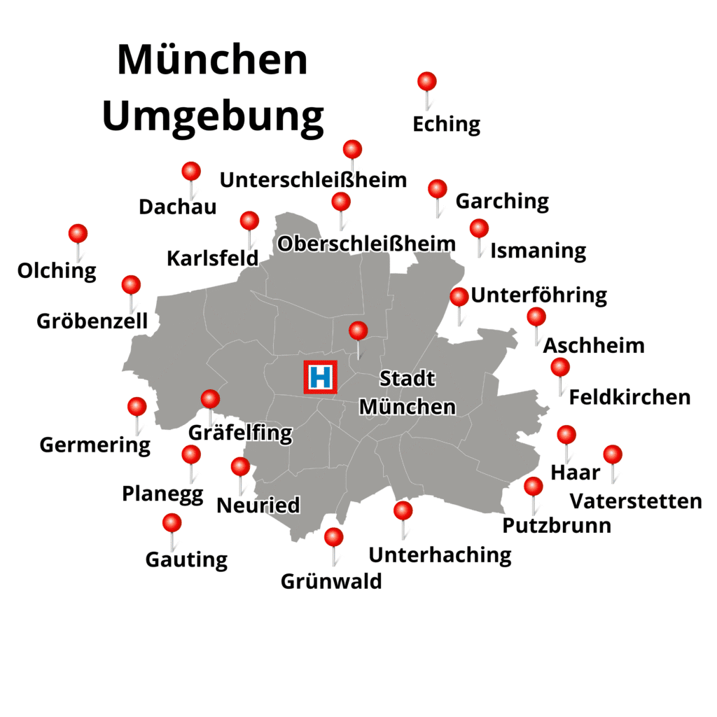Aichach, Altomünster, Andechs, Aschheim, Augsburg, Bad Aibling, Bad Tölz, Bernried, Dachau, Dießen am Ammersee, Dorfen, Ebersberg, Egling, Erding, Feldkirchen, Freising, Fürstenfeldbruck, Garching, Gauting, Geisenfeld, Geretsried, Germering, Gilching, Glonn, Gröbenzell, Gräfelfing, Grünwald, Haar, Hohenbrunn, Holzkirchen, Hohenlinden, Ismaning, Karlsfeld, Kirchseeon, Landshut, Maisach, Markt Schwaben, Moosburg, Murnau, Neubiberg, Neufahrn, Oberhaching, Olching, Ottobrunn, Peißenberg, Pfaffenhofen an der Ilm, Planegg, Puchheim, Pullach, Rosenheim, Schäftlarn, Starnberg, Taufkirchen, Unterschleißheim, Unterföhring, Vaterstetten, Weilheim, Wolfratshausen, Zorneding – und vielen weiteren Orten rund um München.